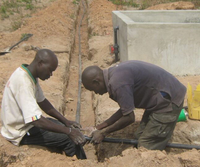 Vers 2013 nous sommes passés aux pompes motorisées.  Nous avons proposé l’électricité ou le carburant. Nous avons mis en place des réseaux de bassins et de robinets. 4 bassins par hectare, ou 15 robinets pour 2 hectares, réduisant considérablement le chemin parcouru par les cultivateurs pour remplir leurs arrosoirs et un puits par hectare, par mesure de sécurité.